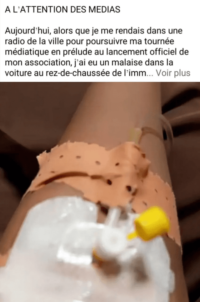 « A l’attention des médias. Aujourd’hui, alors que je me rendais dans une radio de la ville pour poursuivre ma tournée médiatique en prélude au lancement officiel de mon association, j’ai eu un malaise dans la voiture au rez-de-chaussée de l’immeuble de la radio qui me recevait.