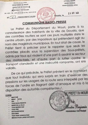Le préfet du département du Wouri a émis un communiqué de mise en garde contre les auteurs de contrôles routiers clandestins dans le Centre ville de Douala. Dans cette sortie, le préfet indique que ces contrôles sont illégaux et que seuls les contrôles placés sous la supervision des sous-préfets font autorité. Ces contrôles ont d’ailleurs été institués