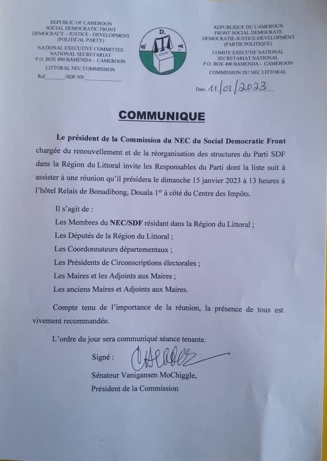 Vers une nouvelle orientation pour le Social démocratic front (SDF) dans le littoral. En effet, le parti de Fru Ndi, se réunit ce dimanc 15 janvier 2023, question de surfer sur les nouvelles orientations du parti dans cette région du pays.